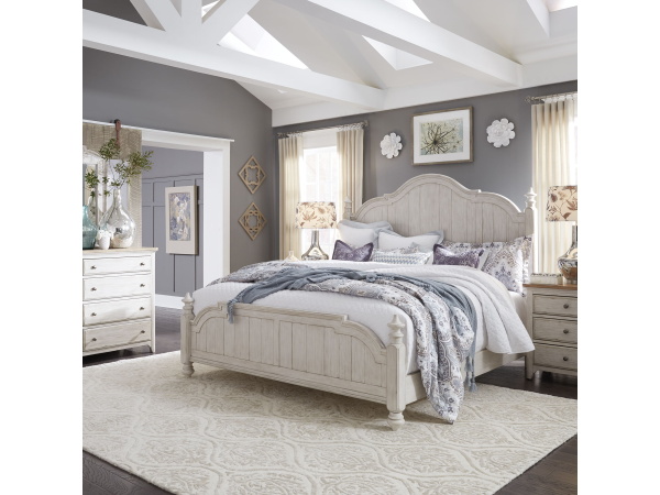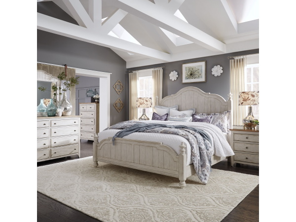 Farmhouse Reimagined – 5 Piece Bedroom Set (King Poster Bed, Dresser & Mirror, Chest, Nightstand) – White