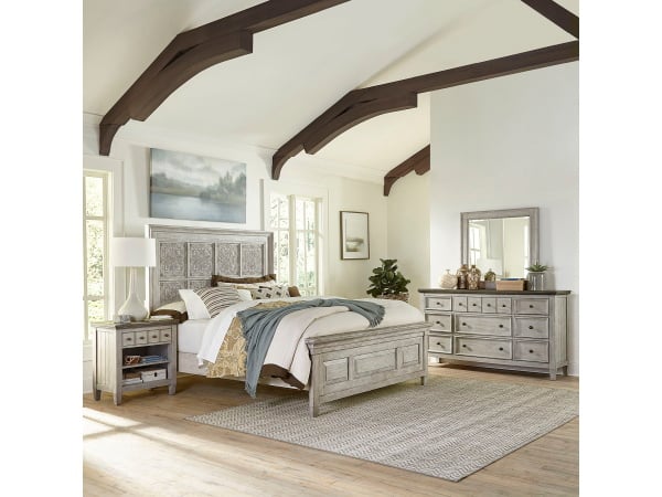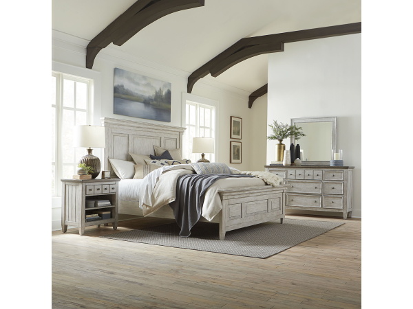 Heartland – 4 Piece Bedroom Set (King Panel Bed, Dresser & Mirror, Nightstand) – Aged White
