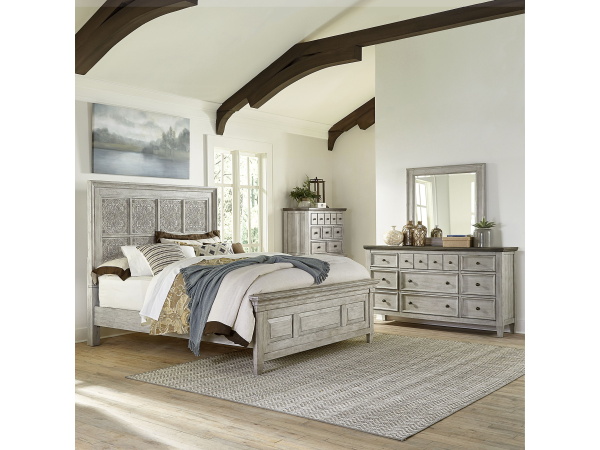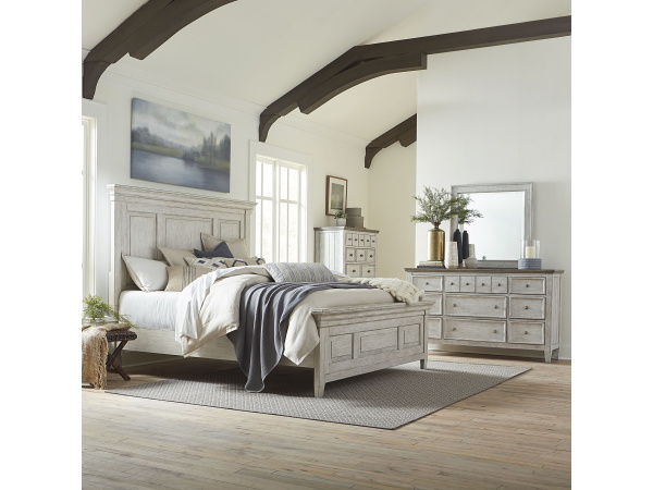 Heartland – 4 Piece Bedroom Set (King Panel Bed, Dresser & Mirror, Chest) – Aged White