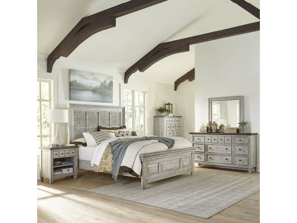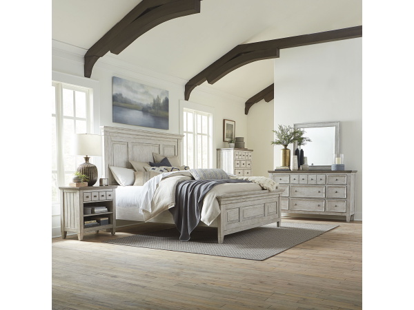 Heartland – 5 Piece Bedroom Set (King Panel Bed, Dresser & Mirror, Chest, Nightstand) – Antique White & Tobacco Tops
