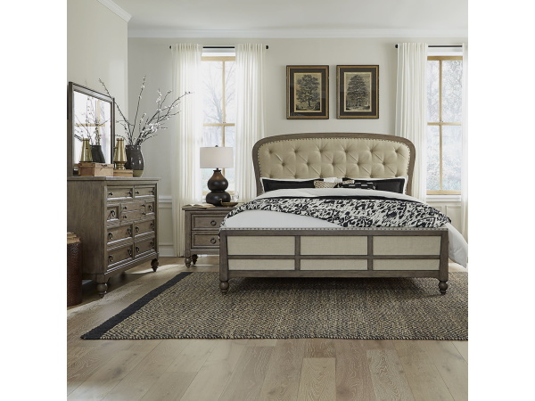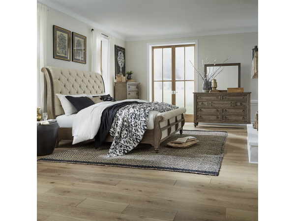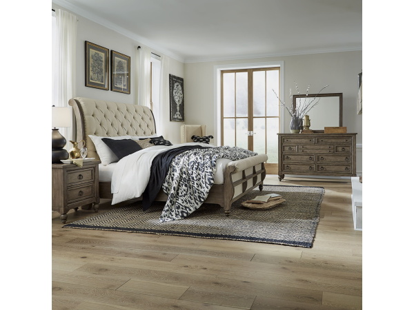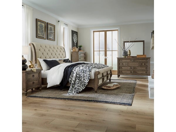 Americana Farmhouse – 4 Piece Bedroom Set (King Sleigh Bed, Dresser & Mirror, Nightstand) – Light Brown