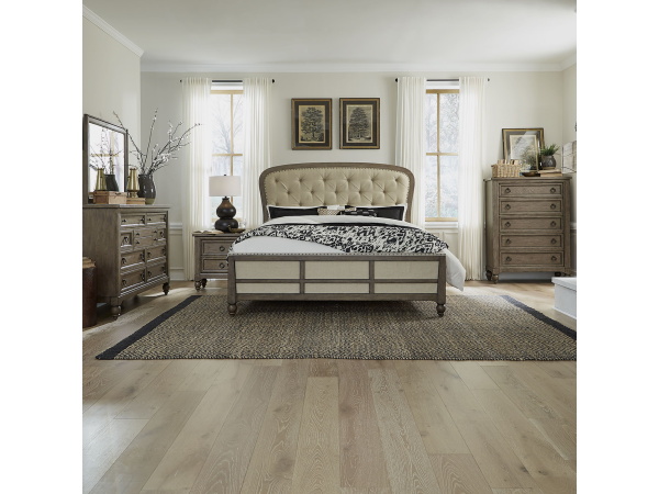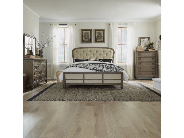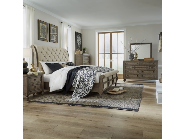 Americana Farmhouse – 5 Piece Bedroom Set (King Sleigh Bed, Dresser & Mirror, Chest, Nightstand) – Light Brown