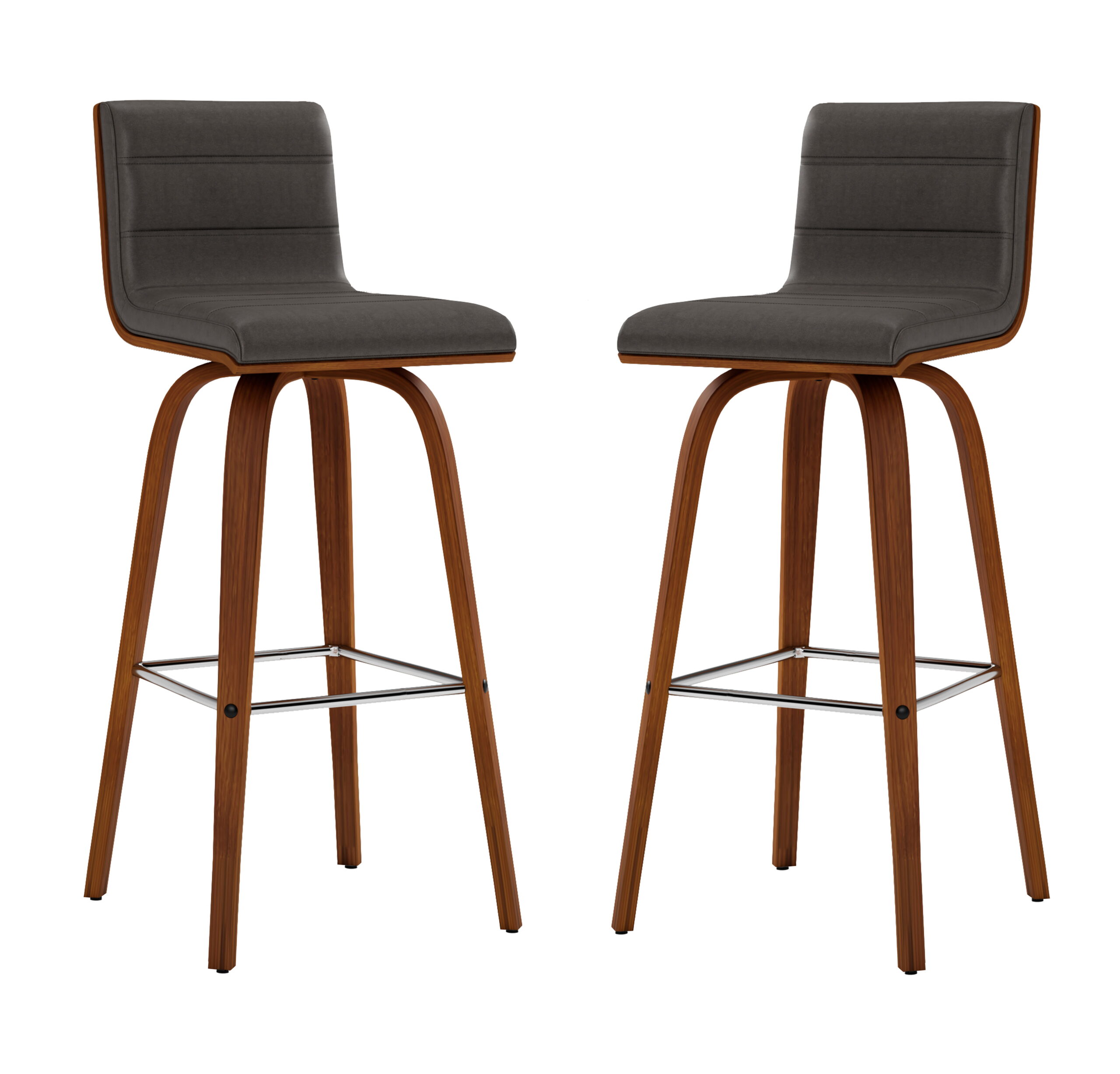 Elevate your space with the classic and sophisticated Vienna Swivel Faux Leather and Wood Counter or Bar Stool by Armen Living. This sleek and versatile barstool seamlessly combines style and comfort with its Mid-Century Modern design, effortlessly integrating into your home’s existing decor. With the 360-degree swivel function, you and your guests have optimal mobility for staying engaged, regardless of your place in the room at any party and gathering. The sturdy frame is constructed with four robust wooden legs, elegantly accentuated by a plush, high-density foam cushion enveloped in high-grade faux leather upholstery. A square, steel footrest adds a touch of chic style without compromising practicality. The soft faux leather upholstery makes the Vienna and ideal choice for any entertaining home! With its two seat height options and armless design, you can the Vienna easily complements your kitchen island, peninsula counter, or home bar. The padded backrest, designed with ergonomic properties, ensures both comfort and proper alignment during use. Ideal for any home or apartment, the Vienna promises enduring comfort with its quality materials, guaranteeing a stylish and comfortable seat for years to come. Choose from the Vienna Counter or Bar Stool in 26” or 30” seat height, available in either a black wood finish with gray faux leather or a walnut wood finish with cream, gray, or brown faux leather to suit your individual taste and enhance your space.