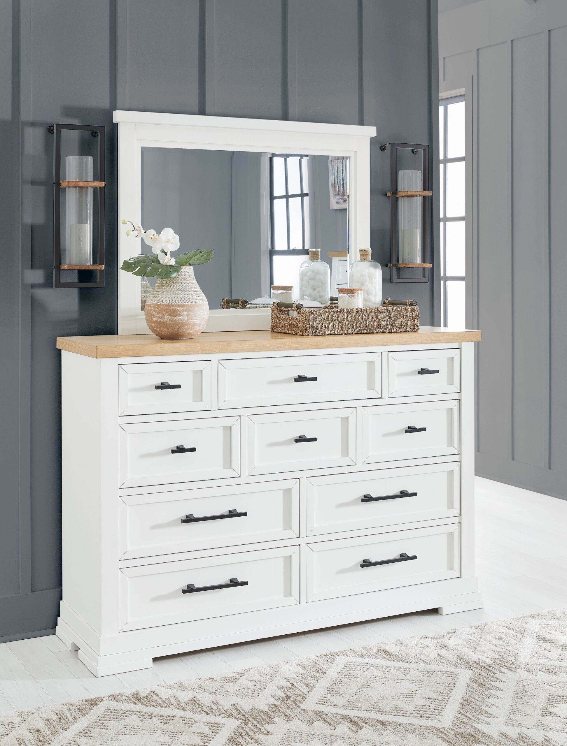 Modern farmhouse design. This two-tone bedroom package raises the bar on comfortably cozy design in your soothing sanctuary. Made with hardwood solids, MDF substrates and butcher block Oak veneer. Stylish two-tone finish featuring butcher block oak veneer tops and classic white cases. Cases feature spacious inset picture framed drawers with fully finished interiors, French/English dovetail construction and metal ball bearing side glides. Top drawers have black felt bottoms. Stylish modern drawer pulls are finished in a matte black accent color. Farmhouse panel storage bed features a stylish board and baton effect with an inset metal barn sash accented with butcher block Oak veneer for a unique take on farmhouse design.