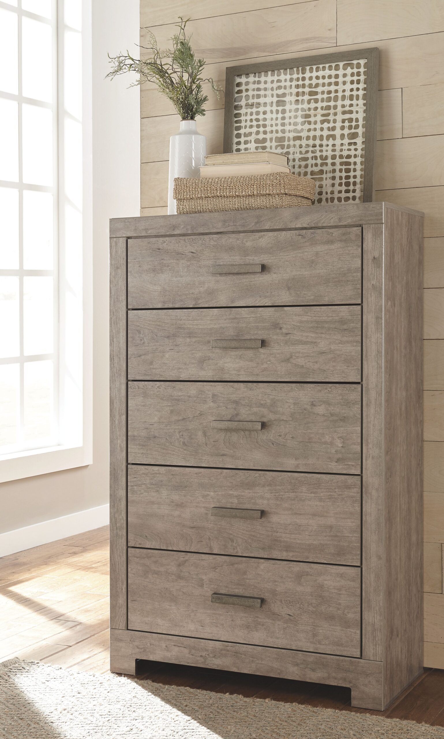 This chest’s weathered driftwood finish evokes such an ethereal vibe—exactly what you need for your serene master suite. Clean lines and simple yet substantial hardware make for a timeless look you’ll love living with for years to come. Five spacious drawers offer ample storage for a wardrobe and spare bed linens.