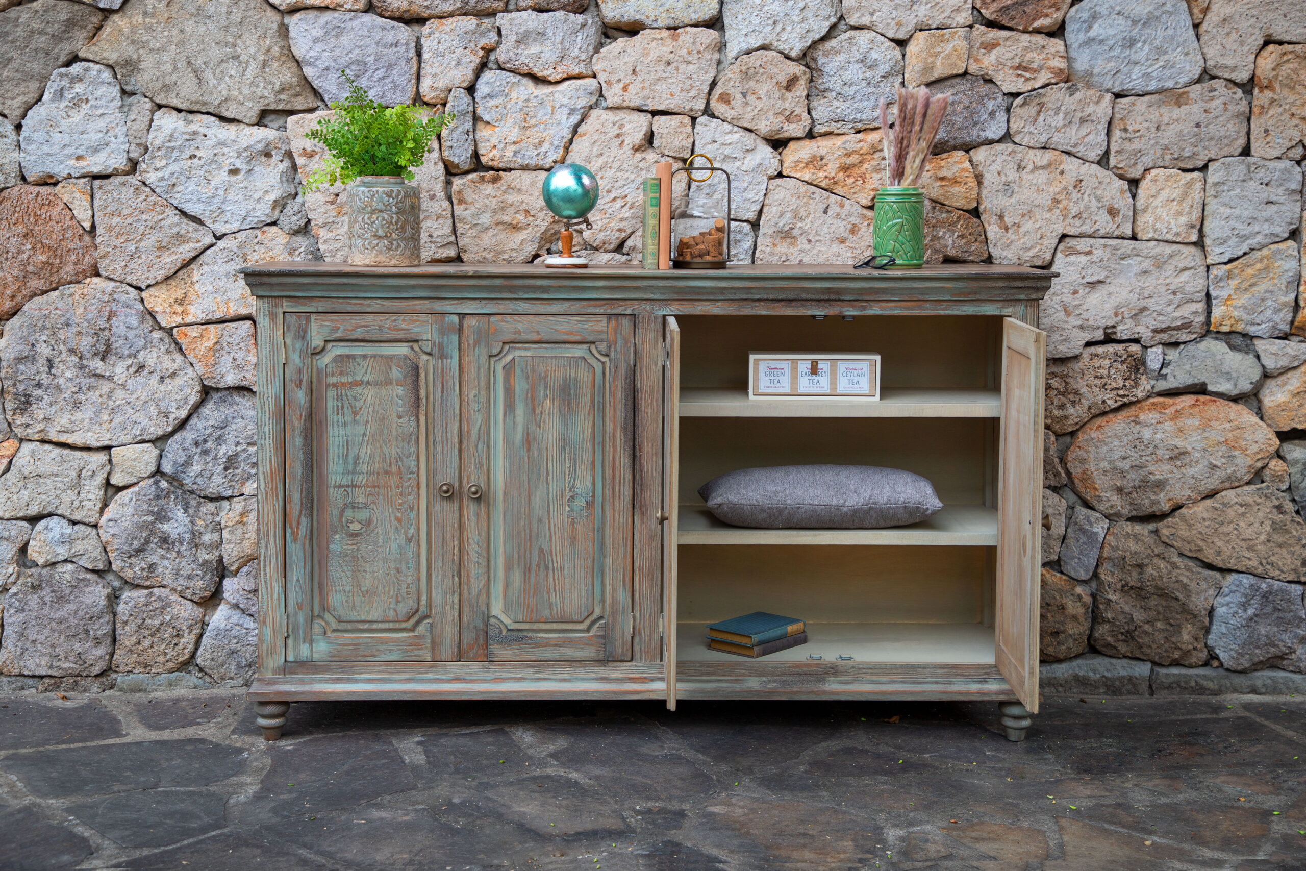 4 Doors Console, Two fixed shelves, Aged Green finish