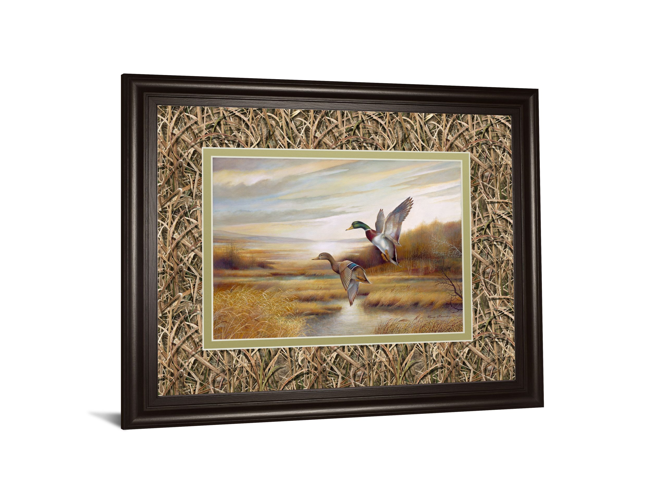 Step into a tranquil marshland where two mallard ducks take graceful flight, captured in exquisite detail. This framed wall art features a unique double mat with a camouflage pattern that adds texture and depth, surrounded by a warm cinnamon mocha frame that complements the natural tones. Perfect for living rooms or offices, it brings a peaceful outdoor scene indoors, blending rustic charm with refined elegance. Crafted with premium materials and real glass, this piece invites you to pause and appreciate the serene beauty of wildlife in motion.
