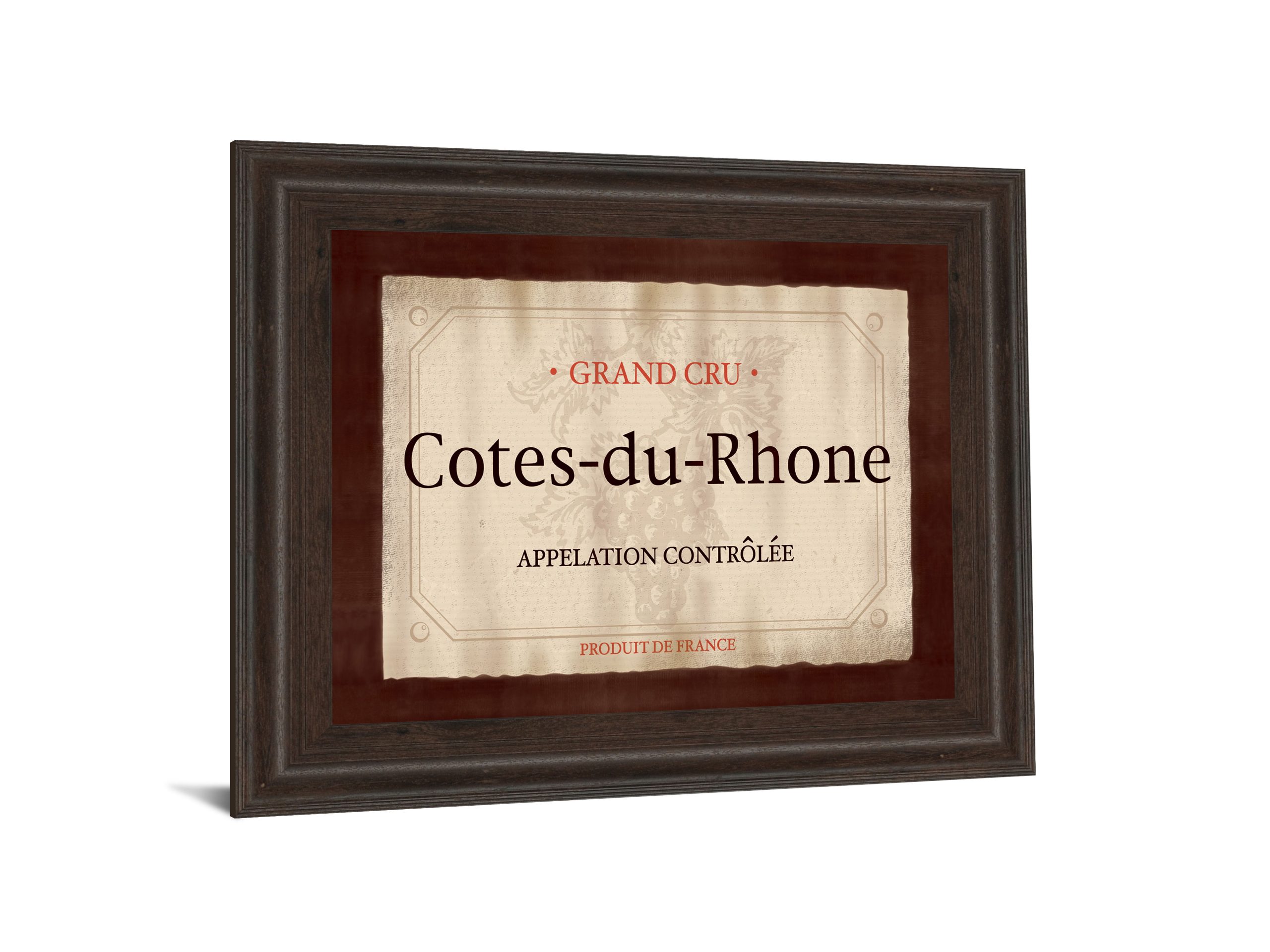 Step into the heart of French wine country with this elegant Cotes-du-Rhone framed wall art. Featuring classic typography and a vintage-inspired label design, it captures the essence of traditional wine culture with subtle hues of brown, beige, and red. The rich cinnamon mocha frame and premium real glass add a warm, sophisticated touch, making it an ideal accent for kitchens, dining rooms, or home bars. Crafted with care in the USA, this piece blends timeless charm with transitional style, perfect for those who appreciate the art of wine and refined home decor.