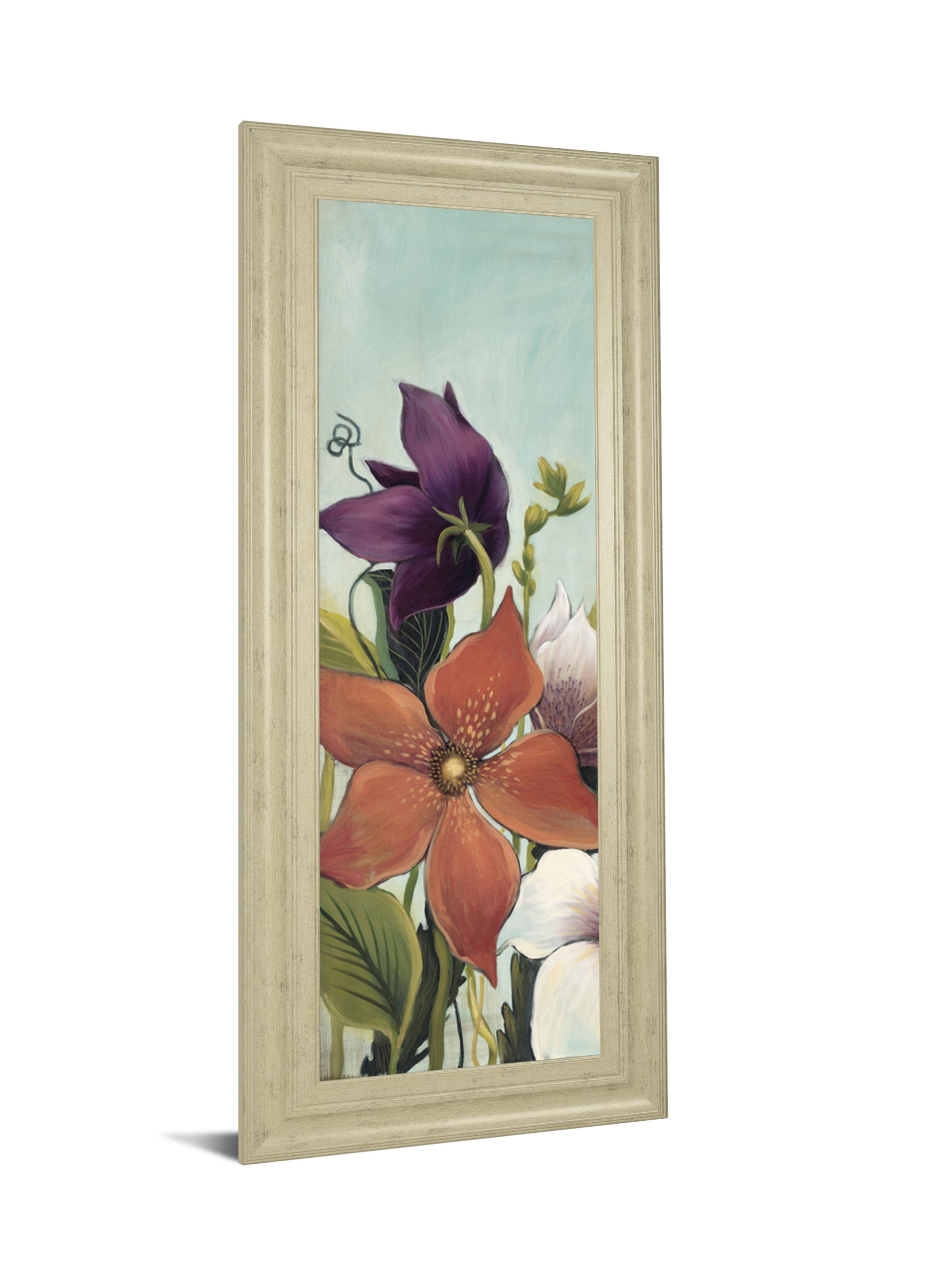 Immerse yourself in the gentle beauty of blooming flowers with this captivating piece that brings nature’s elegance indoors. The artwork features a stunning arrangement of vibrant purple, orange, and white blossoms set against a serene blue backdrop, creating a peaceful yet lively atmosphere. Encased in a sophisticated ivory bliss frame and protected by premium real glass, this 42 by 18-inch framed wall art is crafted with expert care, ready to add a timeless botanical charm to your living room or bedroom decor.
