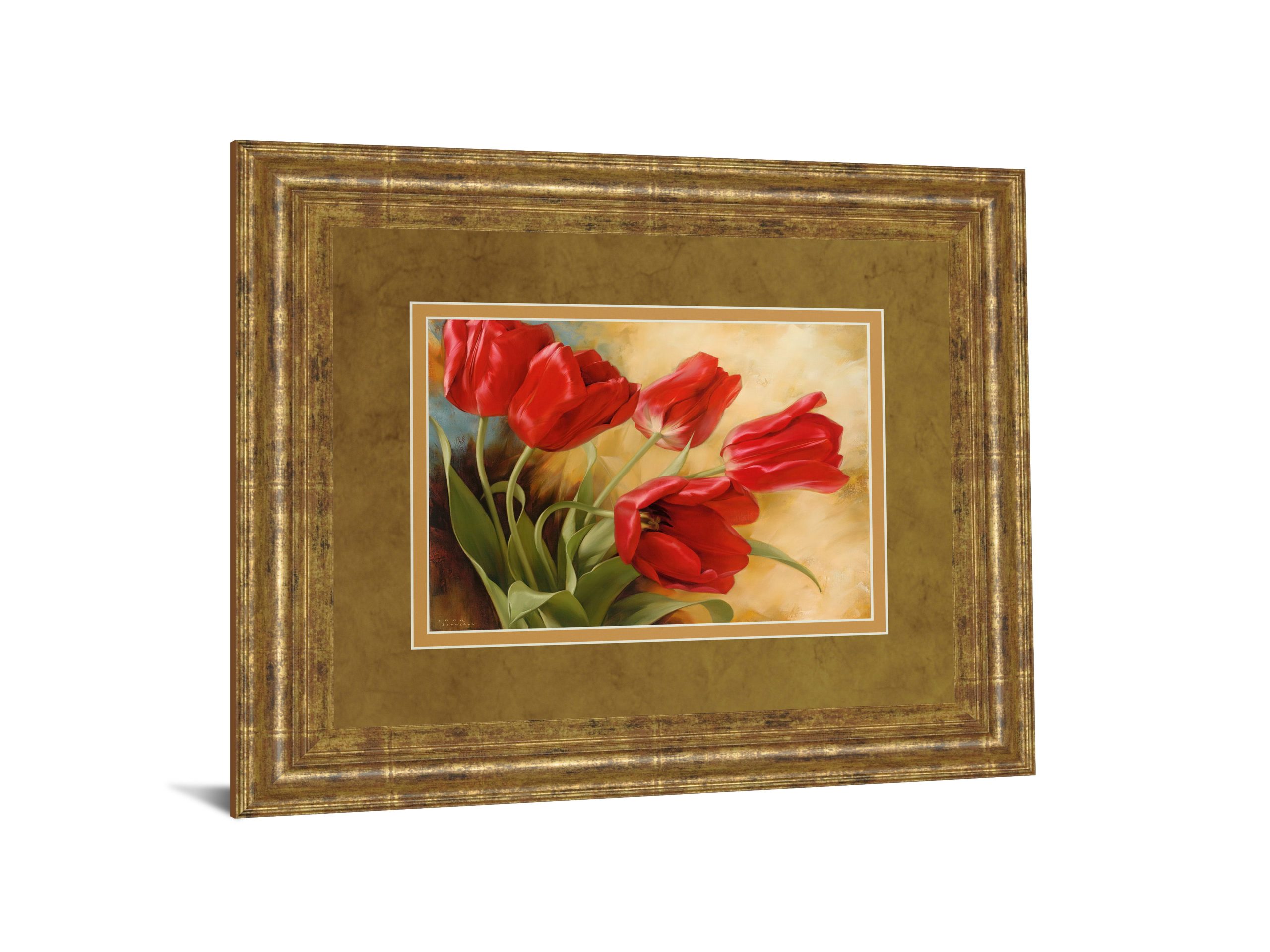Step into a serene garden scene with this captivating framed wall art featuring vivid red tulips in full bloom. The delicate petals and lush green leaves are brought to life against a warm, softly blended background, evoking the gentle beauty of nature indoors. Surrounded by a rich gilded radiance frame with double matting and premium real glass, this piece adds a refined touch of sophistication and depth to any living room or office. Crafted with quality materials and ready to hang, it offers a polished gallery-style finish that complements transitional décor with elegance and charm.