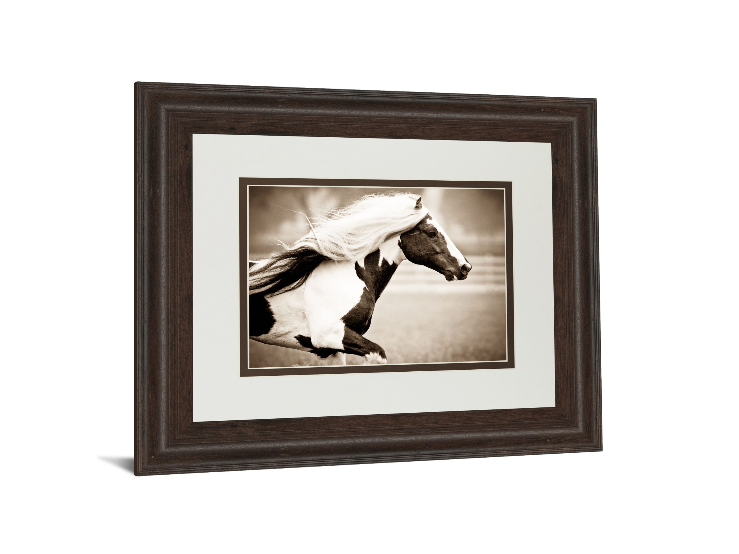 Embrace the wild spirit of the Gypsies Pride with this captivating framed wall art that beautifully captures a horse in graceful motion. Rendered in warm sepia tones, the image evokes a timeless sense of freedom and rustic charm, perfect for enhancing country farmhouse interiors. The rich cinnamon mocha frame, paired with double matting in cream and brown, adds depth and sophistication while premium real glass protects the photograph’s intricate details. Ready to hang and crafted with quality materials, this piece brings a touch of natural elegance and warmth to your living room, office, or den.