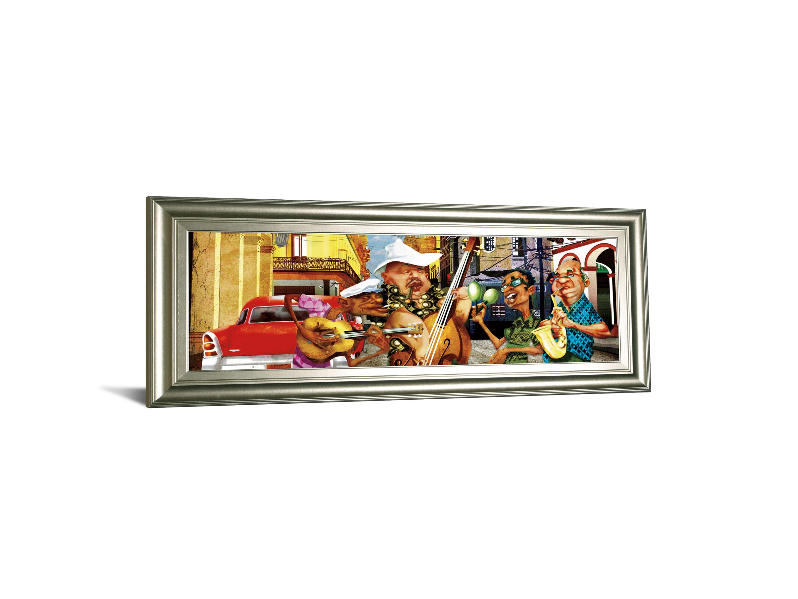 Step into the lively streets of Havana with this vibrant artwork that captures the essence of a spirited Cuban band in full swing. Featuring colorful caricatures of musicians playing guitar, maracas, upright bass, and saxophone, the scene is set against the backdrop of iconic architecture and vintage cars, evoking the rich culture and festive atmosphere of the city. The mirrored frame adds a sophisticated touch, enhancing the depth and warmth of the piece, making it an ideal focal point for living rooms, music rooms, or offices where rhythm and color come alive.