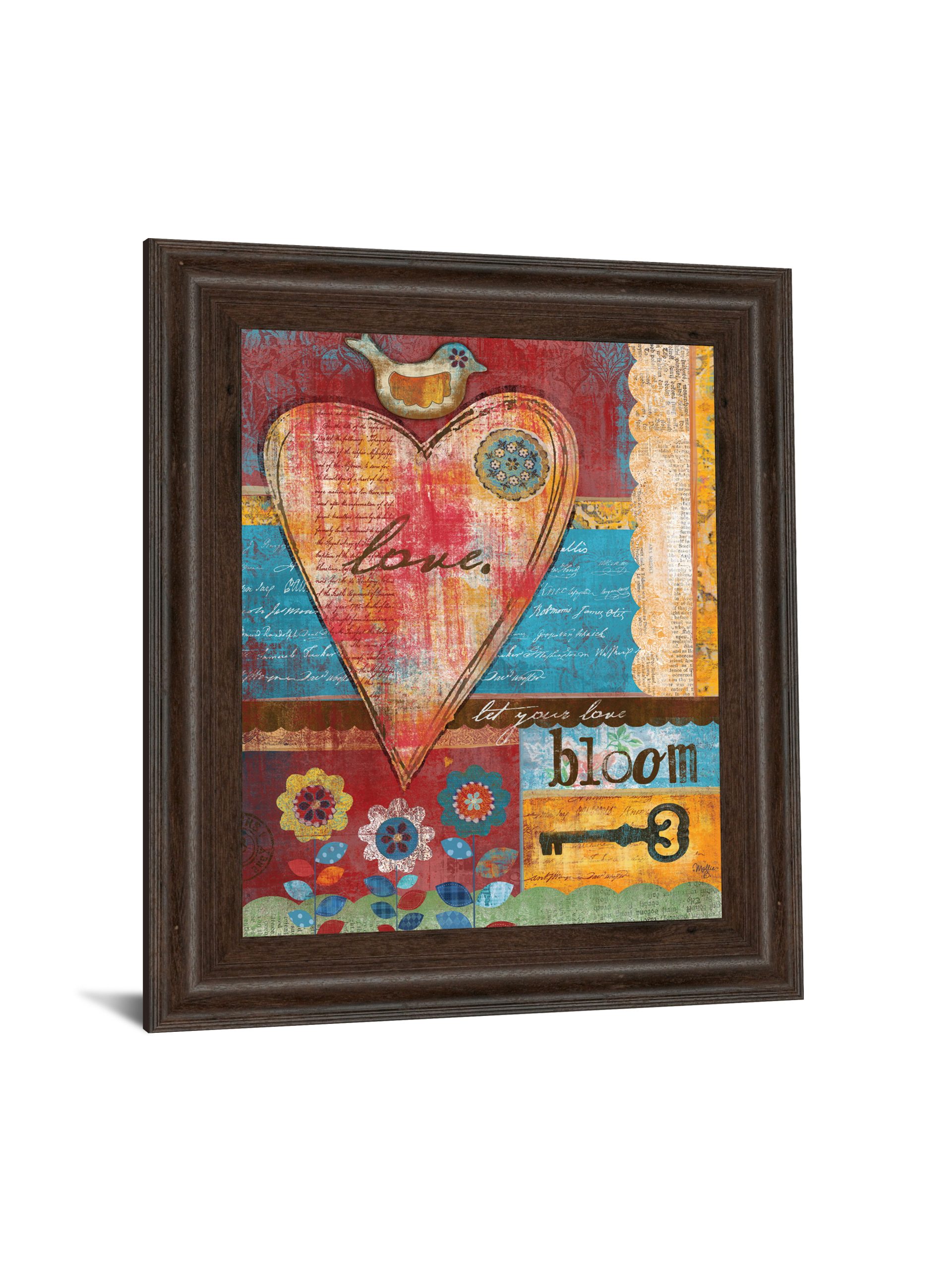 Invite warmth and inspiration into your home with this captivating framed wall art that celebrates the power of love. Featuring a large, textured heart adorned with whimsical floral motifs and a charming bird, this piece blends vibrant reds, blues, yellows, and earthy tones in a joyful patchwork design. The elegant cinnamon mocha frame adds a rich, sophisticated touch, while the premium real glass enhances every detail and color vibrancy. Crafted with expert care in the USA, this contemporary mixed media artwork is ready to hang and perfect for brightening living rooms, bedrooms, or offices with a heartfelt message to let your love bloom.