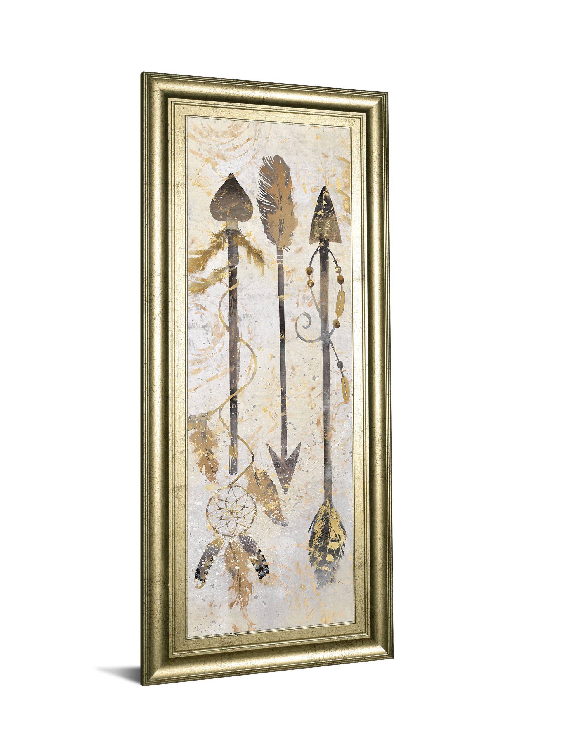 This striking piece captures the essence of tribal heritage through three distinct arrows, each adorned with feathers, beads, and a dreamcatcher motif, rendered in muted gold, brown, and gray tones. The textured background and subtle gold accents evoke a sense of history and artistry, making it a sophisticated addition to any living room or office. Encased in a crisp chardonnay frame with premium real glass, this vertical artwork offers both elegance and protection, ready to become a meaningful focal point that complements contemporary interiors with cultural depth and refined style.