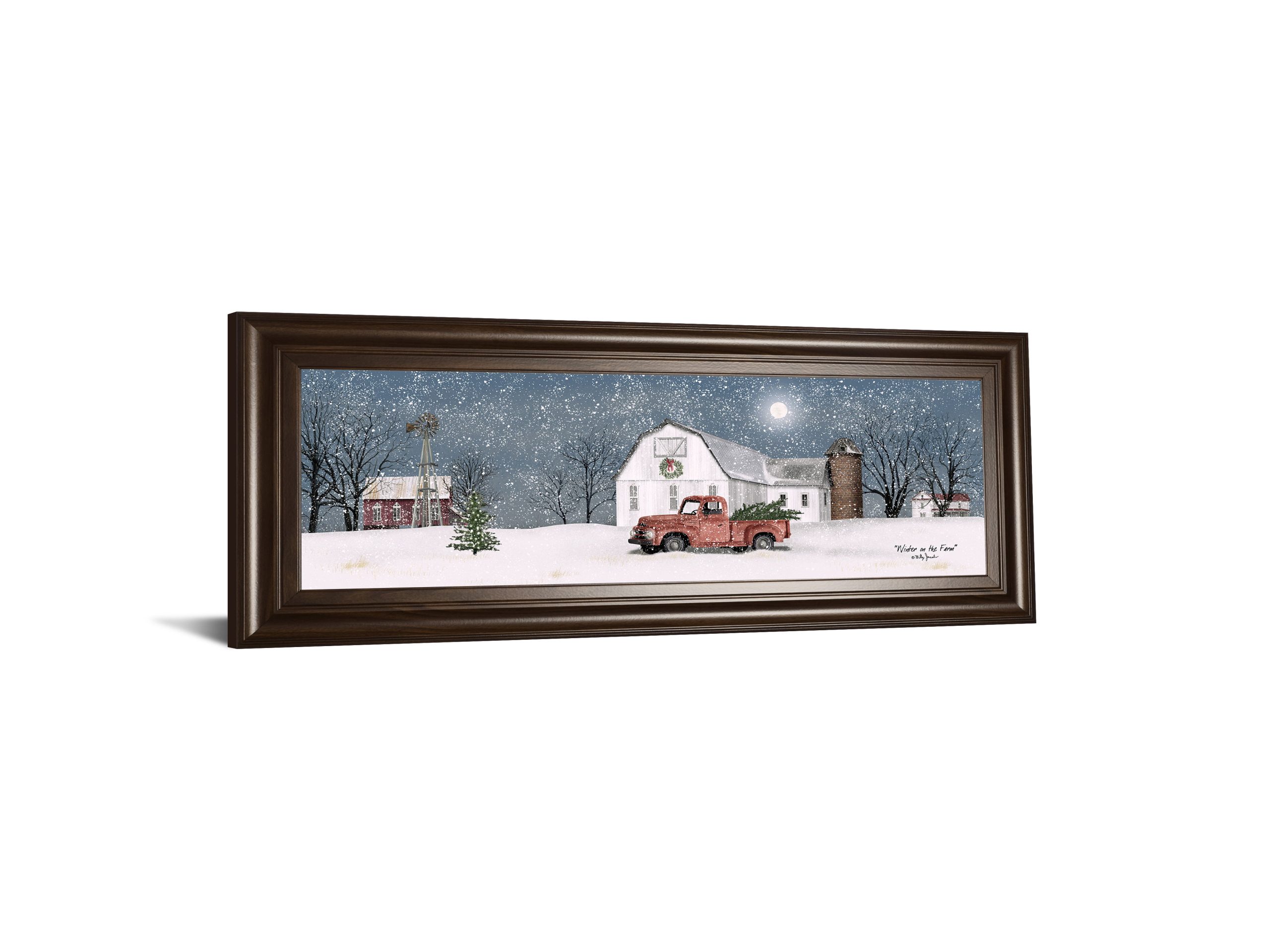Step into a peaceful winter night on the farm with this charming scene that captures the quiet beauty of snow gently falling over a classic red truck carrying a freshly cut pine tree. The white barn, adorned with a festive wreath, and the rustic windmill stand quietly beneath a glowing full moon, evoking a sense of nostalgia and warmth. Framed in rich brown wood, this artwork brings a cozy farmhouse spirit to any living room, kitchen, or den, inviting you to savor the simple joys of the holiday season and the serene countryside.