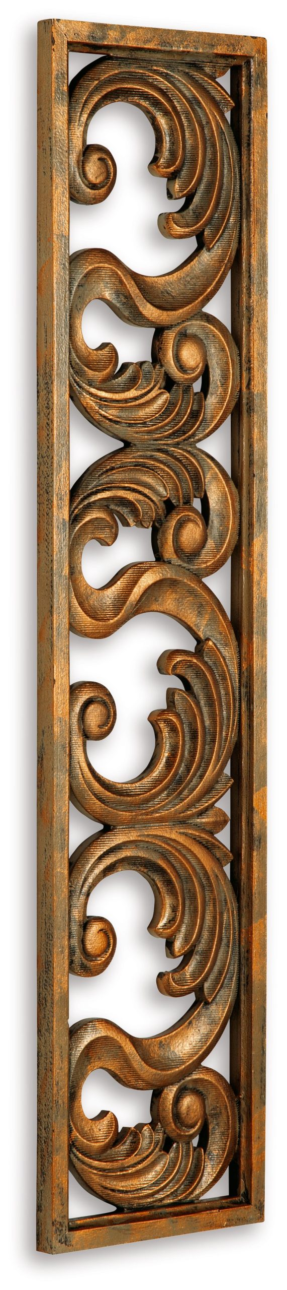Grace your home with an epic, expensive feel without breaking the bank. This wall sculpture’s stately scrollwork design is dressed in an antiqued goldtone finish. Hang it in your entryway to set a tasteful tone, or place it next to picture frames on a gallery wall to create a polished and poised look.