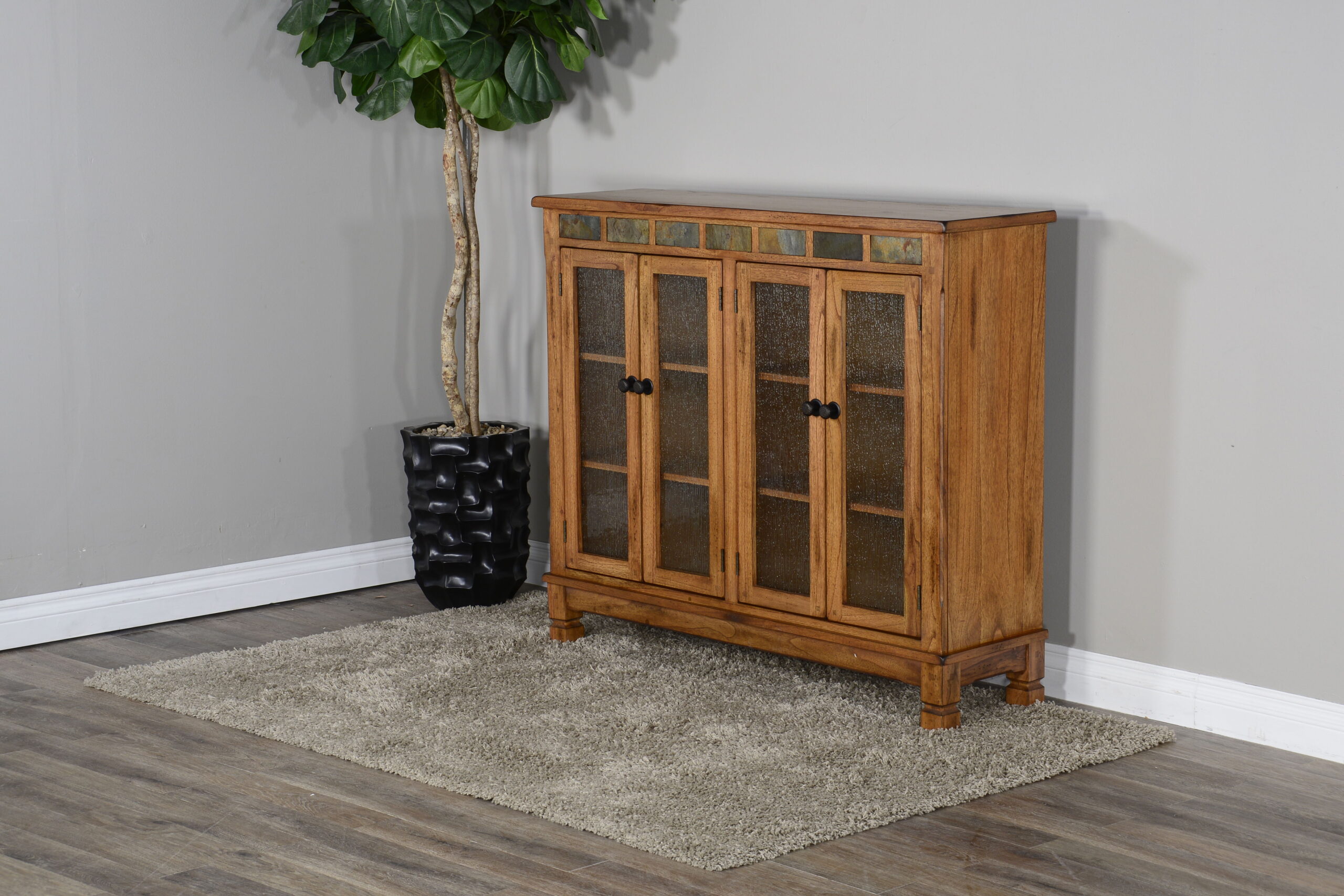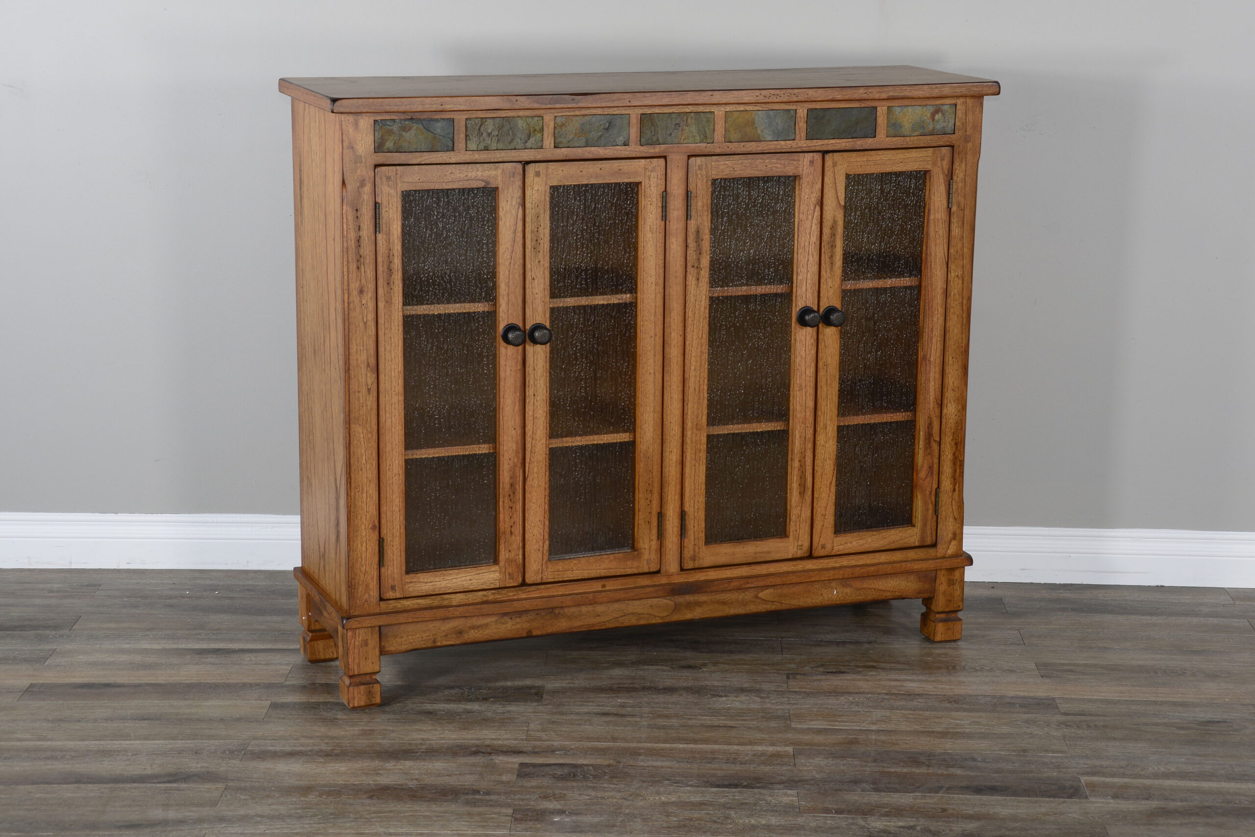 Elevate your home decor with this versatile bookcase that effortlessly adds a pop of personality to any arrangement The inclusion of textured glass doors and wood shelves provides storage for accents, your favorite novels, creating a visually clean display that evokes a sense of warmth and character. Additionally, the bookcase boasts natural slate accents, adding a touch of rustic charm and further enhancing its aesthetic appeal. Perfect for curating a personalized and inviting atmosphere in your living space.