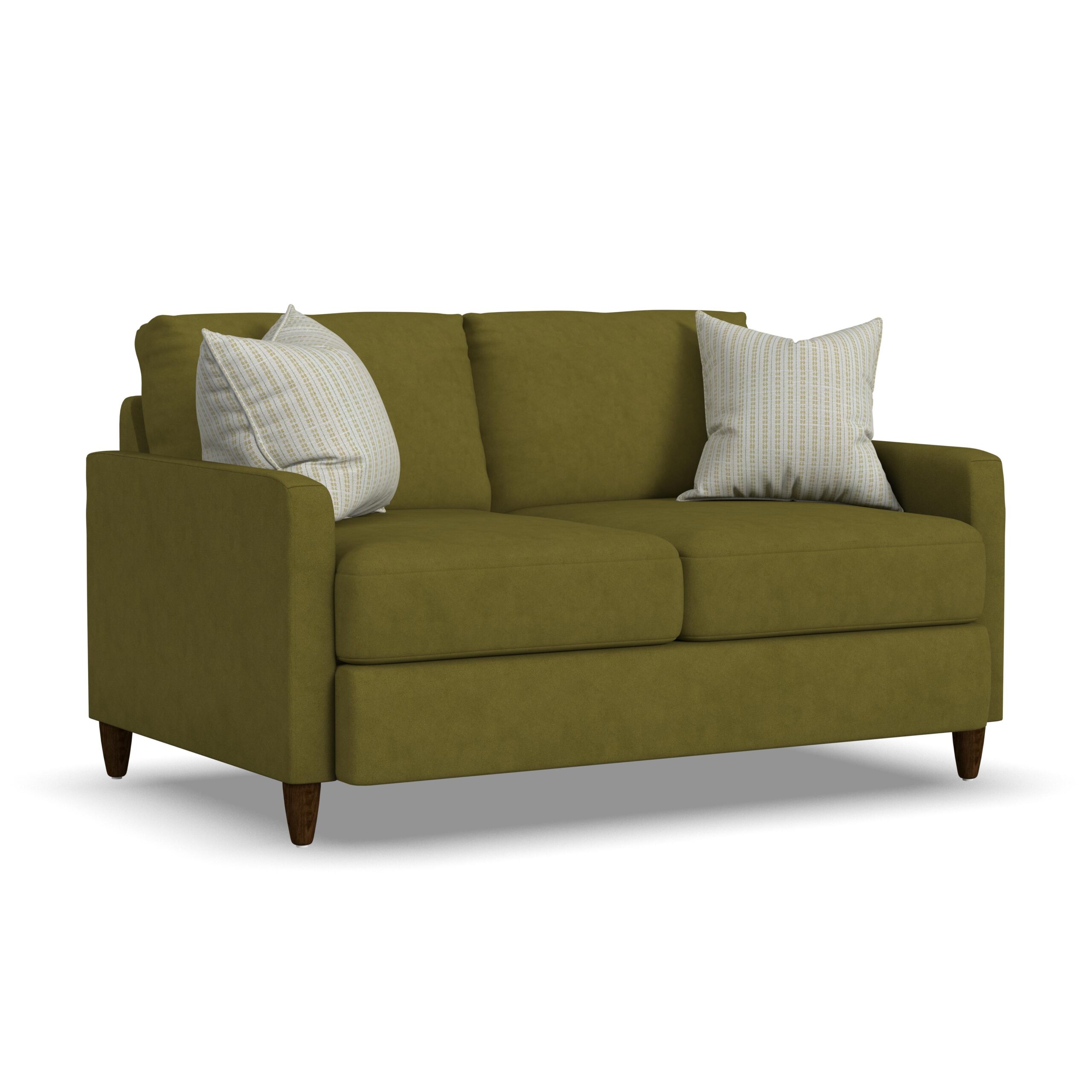 Clean lines and a cantilevered front make the Fern loveseat a welcome addition to any home. With generous seating space from arm to arm, Fern provides plenty of roomy comfort for two people to lounge and relax together. Round tapered legs positioned directly under the narrow track arms offer a distinctively modern architectural feel to spaces. Loose back cushions with a casual pleat design and the included knife-edge accent pillows complete the on-trend look of Fern.