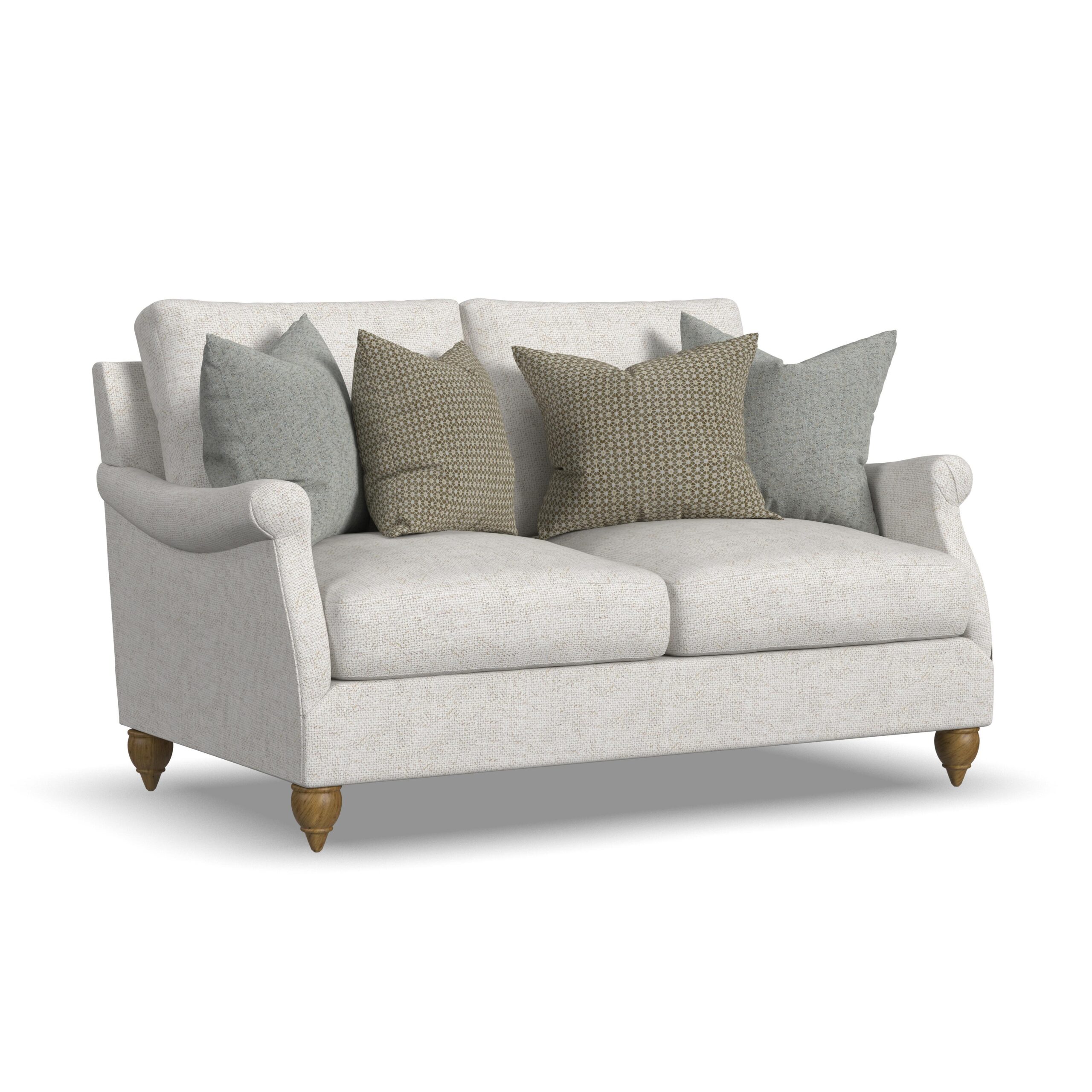 Traditional elegance gets a fresh reinterpretation with the Veda loveseat. The petite, pleated roll arms slope down onto stately legs, delivering timeless details and graceful curves that soften the room while adding an abundance of charm. Generous seat space, cushion fill choices, and the Blue Steel Spring at the heart of each seat ensure lasting comfort. And bring your room together with four accent pillows, orderable in your choice of fabric.