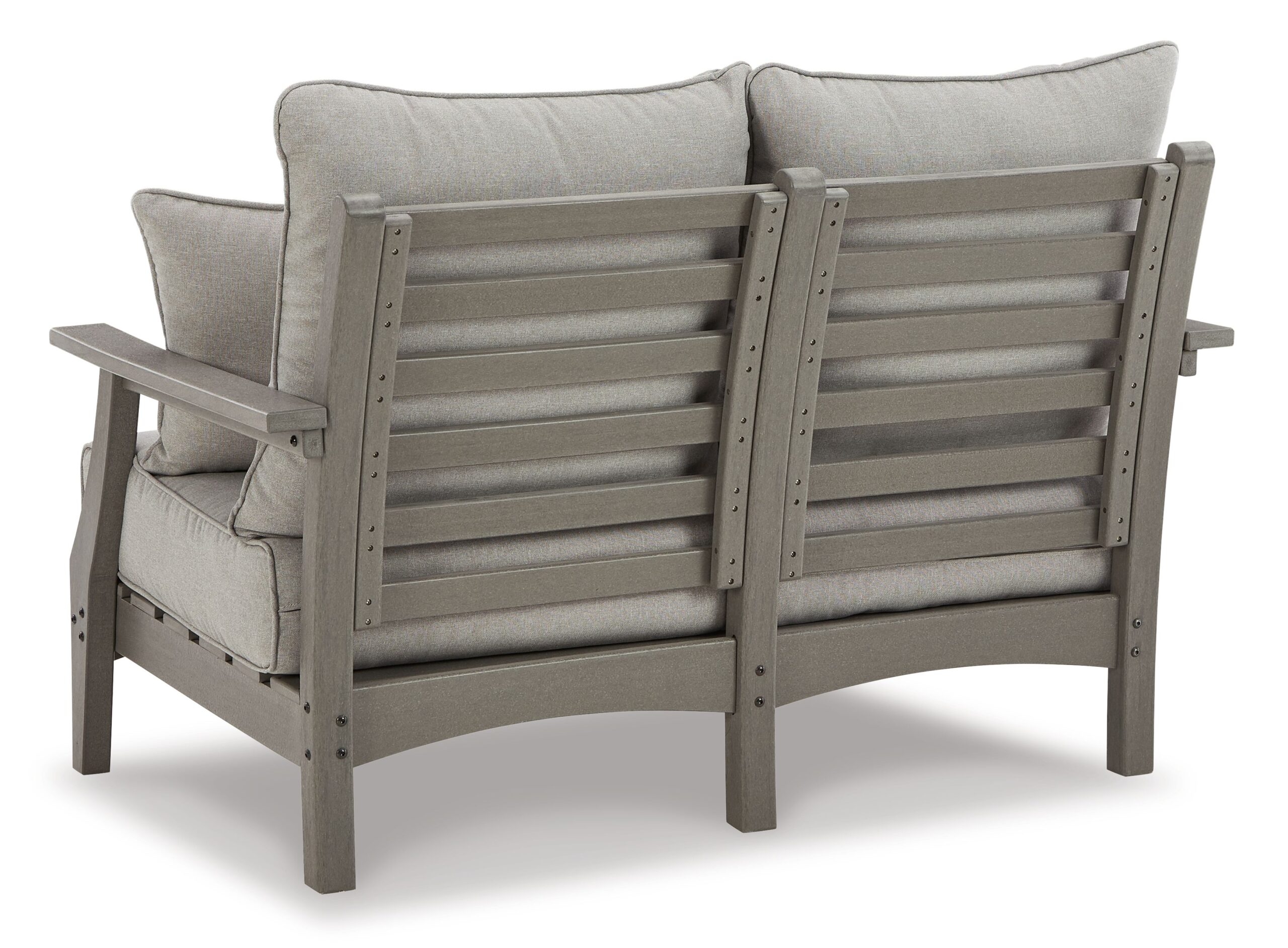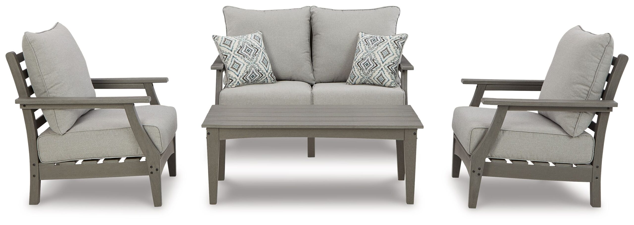 It’s the dawn of a new day for gray. Embrace the style trend with this loveseat, set of 2 chairs and coffee table set. Crafted of HDPE material that combines the exceptional durability and weather resistance you need with the “wood look” you love, this timeless set takes al fresco living to a whole new level. Slatted styling on the table naturally sheds rainwater. The thick seat and back cushions on the chairs and loveseat are wrapped in our exclusive Nuvella® high-performance fabric that’s fade resistant, stain resistant and a breeze to clean.