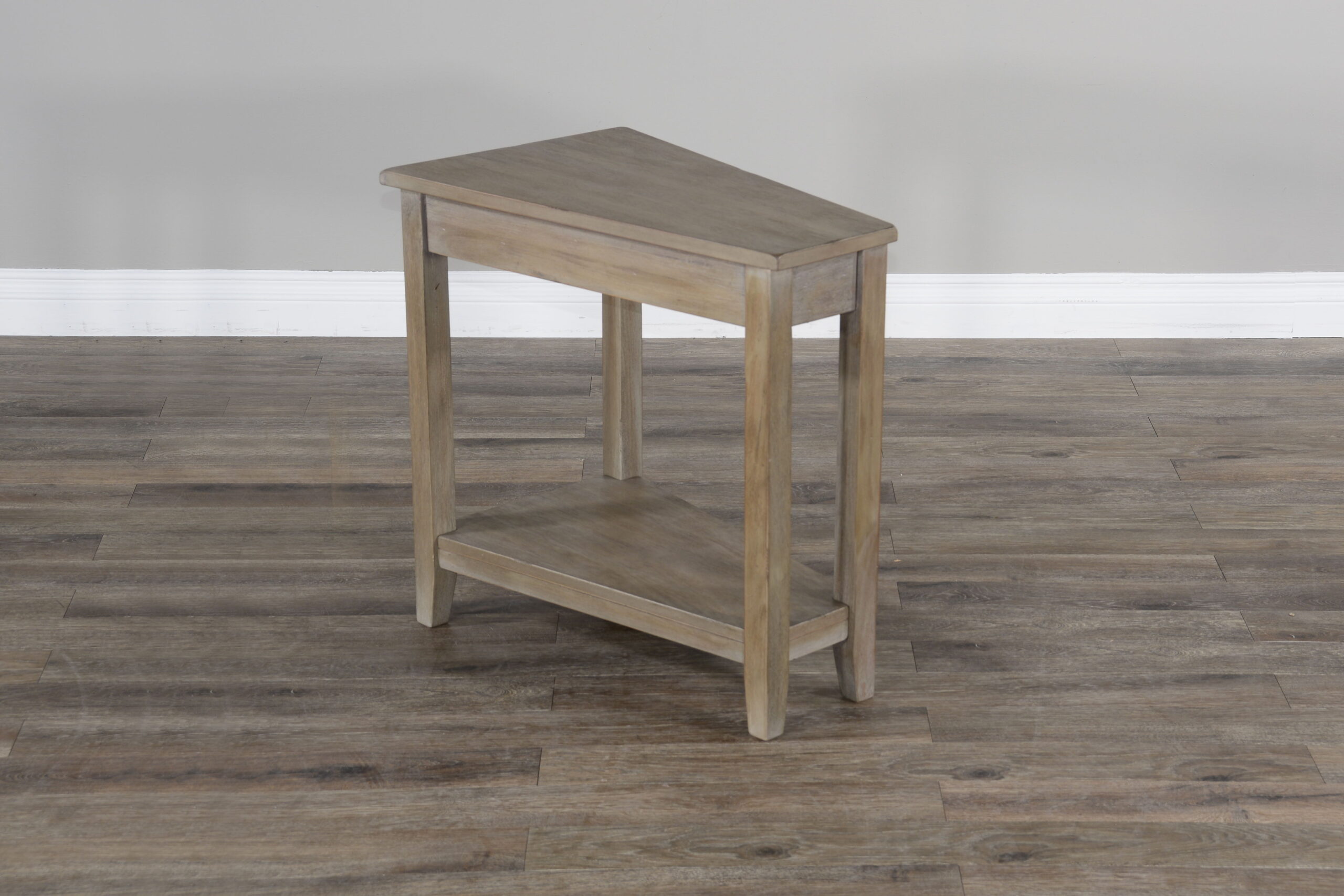 Whether set chairside, next to your sofa or pulled up to your bedside for a distinctive nightstand, this chair side wedge table is an excellent addition to any ensemble. This simple design offers one open lower shelf that is great for accent decor, stacking your go-to novels, or fanning out your favorite magazines.